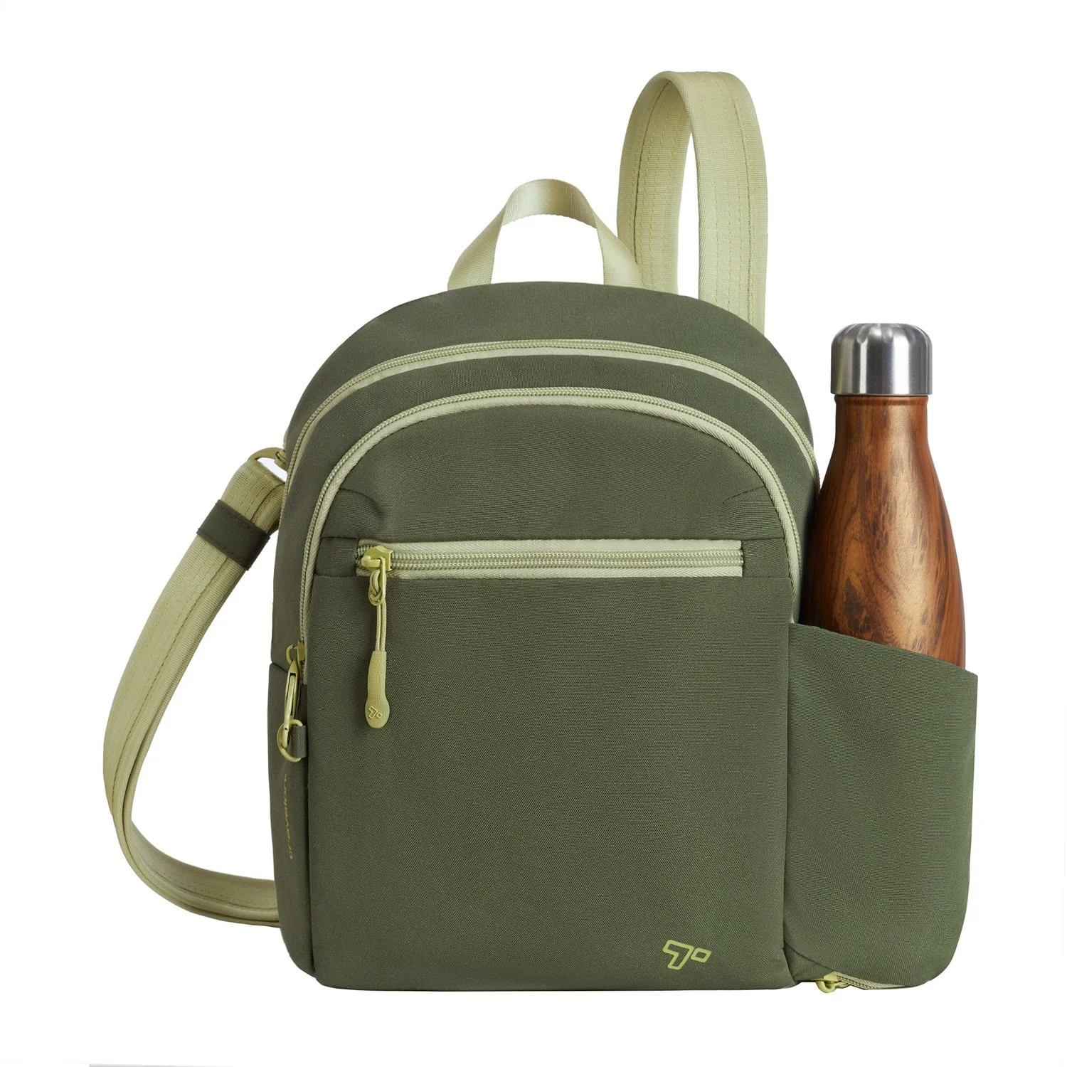 This durable bag has two roomy, locking compartments. One with a zippered pocket, to wrangles the small stuff, and a padded tablet sleeve. The other with an interior organization that includes: An RFID blocking passport drop pocket and 3 card slots to protect you from identity theft; and a tethered key clip helps prevent search and rescue missions for car and house keys. An expandable zippered air mesh water bottle pocket ensures you have everything you need to keep going all day long.
